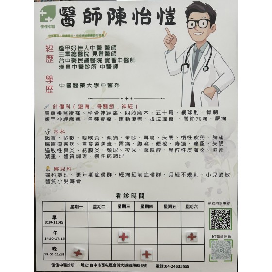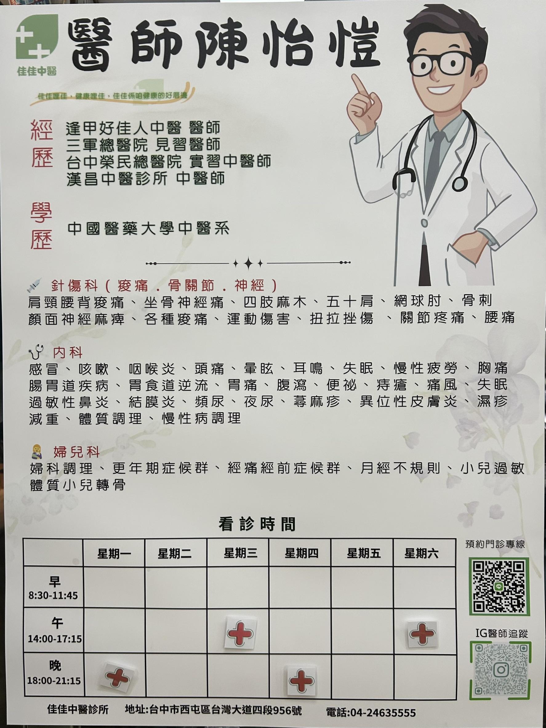 各種痠痛、運動傷害、扭拉挫傷、關節疼痛、腰痛、坐骨神經痛、顏面神經麻痺、減重、轉骨、感冒、咳嗽、過敏性鼻炎、頭痛、腸胃道疾病、胃痛、胃食道逆流、便秘、頻尿、夜尿、失眠、經痛、經前症候群、月經不規則