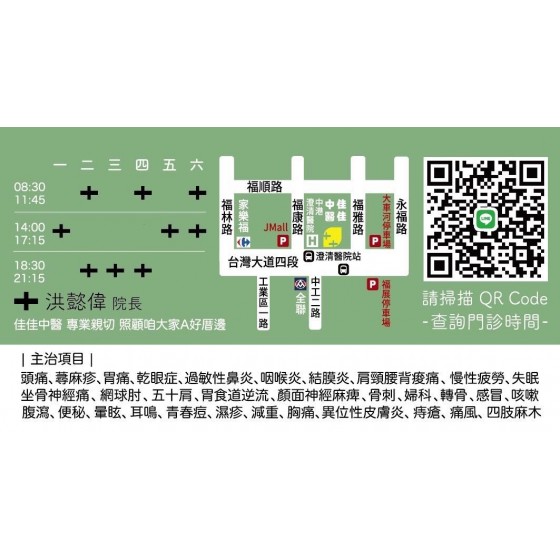 頭痛、蕁麻疹、胃痛、乾眼症、過敏性鼻炎、咽喉炎、結膜炎、肩頸腰背痠痛、慢性疲勞、坐骨神經痛、網球肘、五十肩、胃食道逆流、顏面神經麻痺、骨刺、婦科、失眠、轉骨、感冒、咳嗽、腹瀉、便秘、暈眩、耳鳴、青春痘、濕疹、減重、異位性皮膚炎、痔瘡、胸痛、痛風、四肢麻木