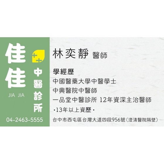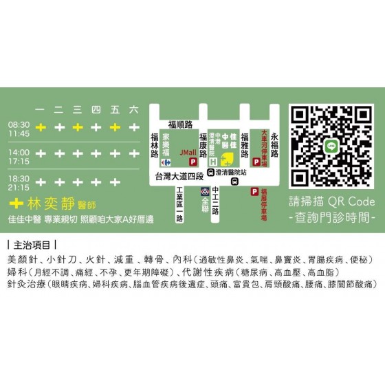 美顏針、小針刀、火針、減重、轉骨、內科(過敏性鼻炎、氣喘、鼻竇炎、胃腸疾病、便秘)、婦科(月經不調、痛經、不孕、更年期障礙)、代謝性疾病(糖尿病、高血壓、高血脂)、針灸治療(眼睛疾病、婦科疾病、腦血管疾病後遺症、頭痛、富貴包、肩頸酸痛、腰痛、膝關節酸痛)