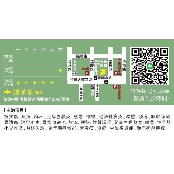 扭挫傷、痠痛、麻木、足底筋膜炎、感冒、咳嗽、過敏性鼻炎、減重、頭痛、睡眠障礙、胃潰瘍、消化不良、胃食道逆流、腹瀉、便秘、體質調理、兒童生長發育、轉骨、性早熟、小兒推拿、月經失調、更年期症候群、青春痘、濕疹、中風後遺症、顏面神經麻痺